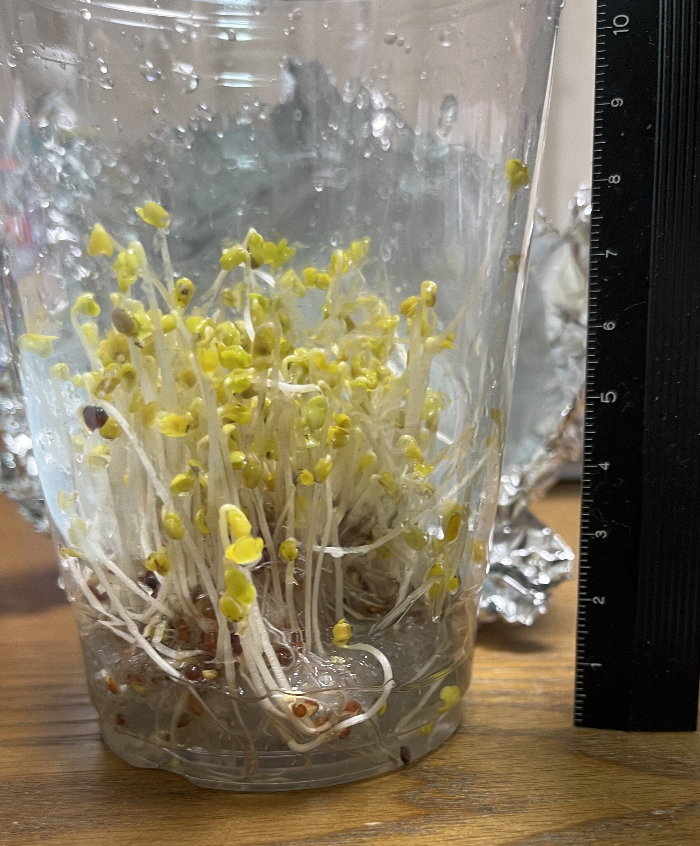 播種から11日目です。上から見ると、どんどん密集してきているのが分かります。長さを測ってみると、一番長いもので7.5cmくらいありました。